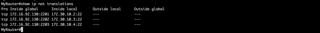 MyRouter(config)#ip nat inside source static tcp 172.30.10.2 22 172.16.92.130 2201 MyRouter(config)#ip nat inside source static tcp 172.30.10.3 22 172.16.92.130 2202 MyRouter(config)#ip nat inside source static tcp 172.30.10.4 22 172.16.92.130 2203