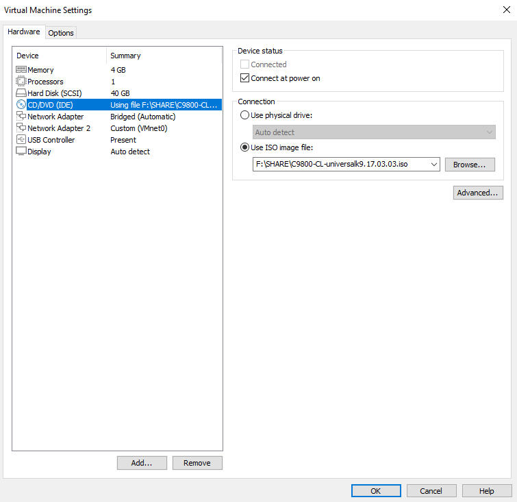 In The Virtual Machine Settings, Select the CD/DVD to ISO Image that used. I’m add more Network Adaptor so the WLC has 2 interfaces.