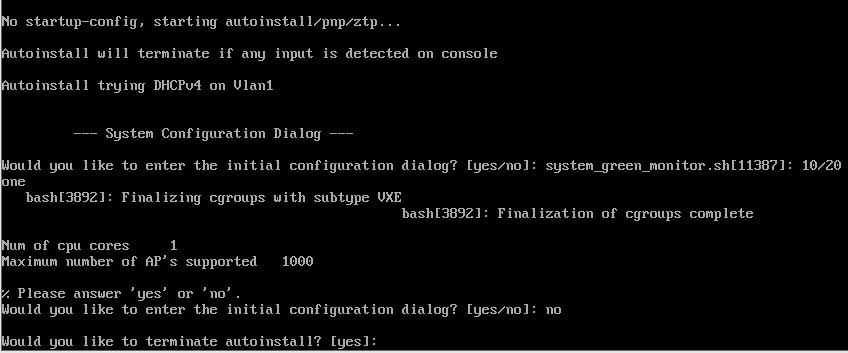After the installation process completed, we need to confirmation the initial config. Enter no for initial config and yes for the terminate autoinstall.