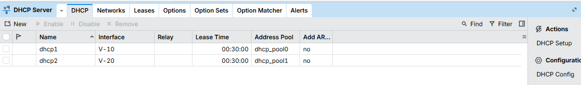 Configure IP Address and IP DHCP Servers for VLAN 10 and VLAN 20 interfaces to provide dhcp service for the PCs. Refers to Configure DHCP Mikrotik to DHCP Configuration.