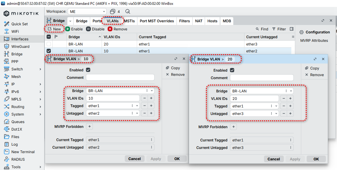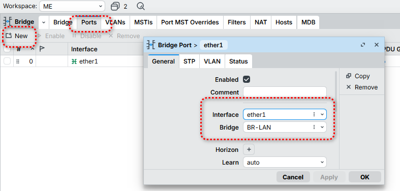 - Create New Add interface ether1 with Bridge BR-LAN. Ether1 is used to tagged port to Router1